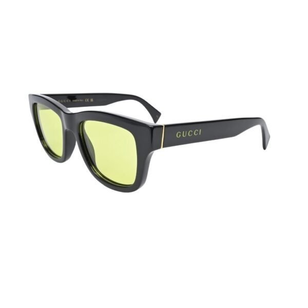 The Gucci GG1135S 005 sunglasses are a punch of personality. With a chunky black frame, sharp angles, and neon yellow-tinted lenses, this style delivers a futuristic retro vibe. Finished with Gucci branding in matching neon on the temples and a sleek gold hinge accent—this pair is built for those who dare.