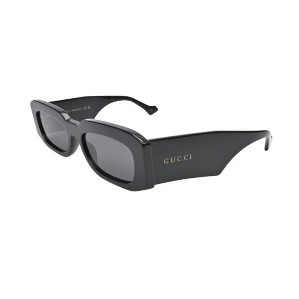 The Gucci GG1426S 001 is a statement of sleek power. Featuring a sharp rectangular silhouette in glossy black acetate with a bold wide temple and gold Gucci branding, this frame is your go-to for a fierce, fashion-forward presence.